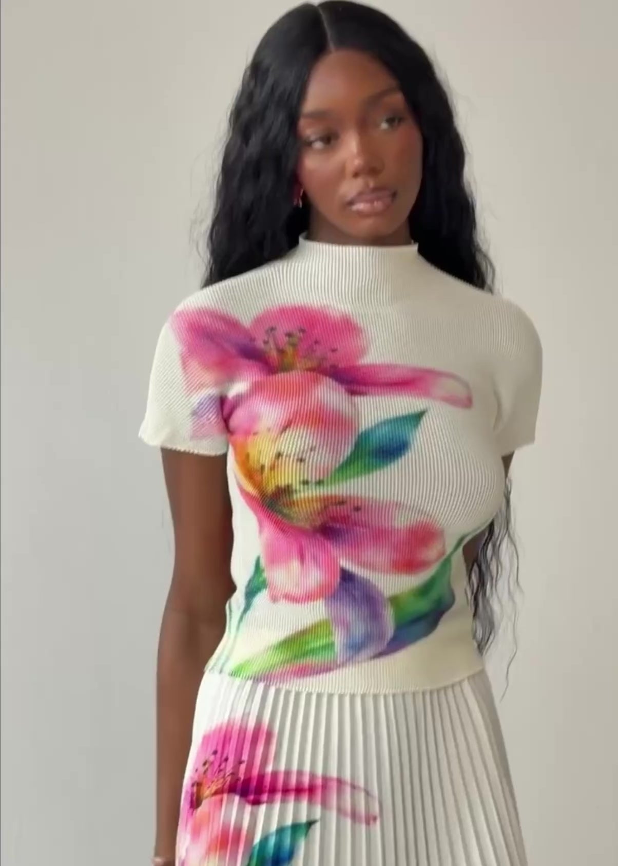 Our Blossom Print Top is a soft statement piece designed to turn heads. Featuring a delicate watercolour floral print on a fresh cream base, it blends femininity with modern elegance. The sleek high neckline and sculpted fit create a flattering, polished silhouette. Perfect on its own or paired with the matching Blossom Pleated Skirt for the ultimate coordinated look.